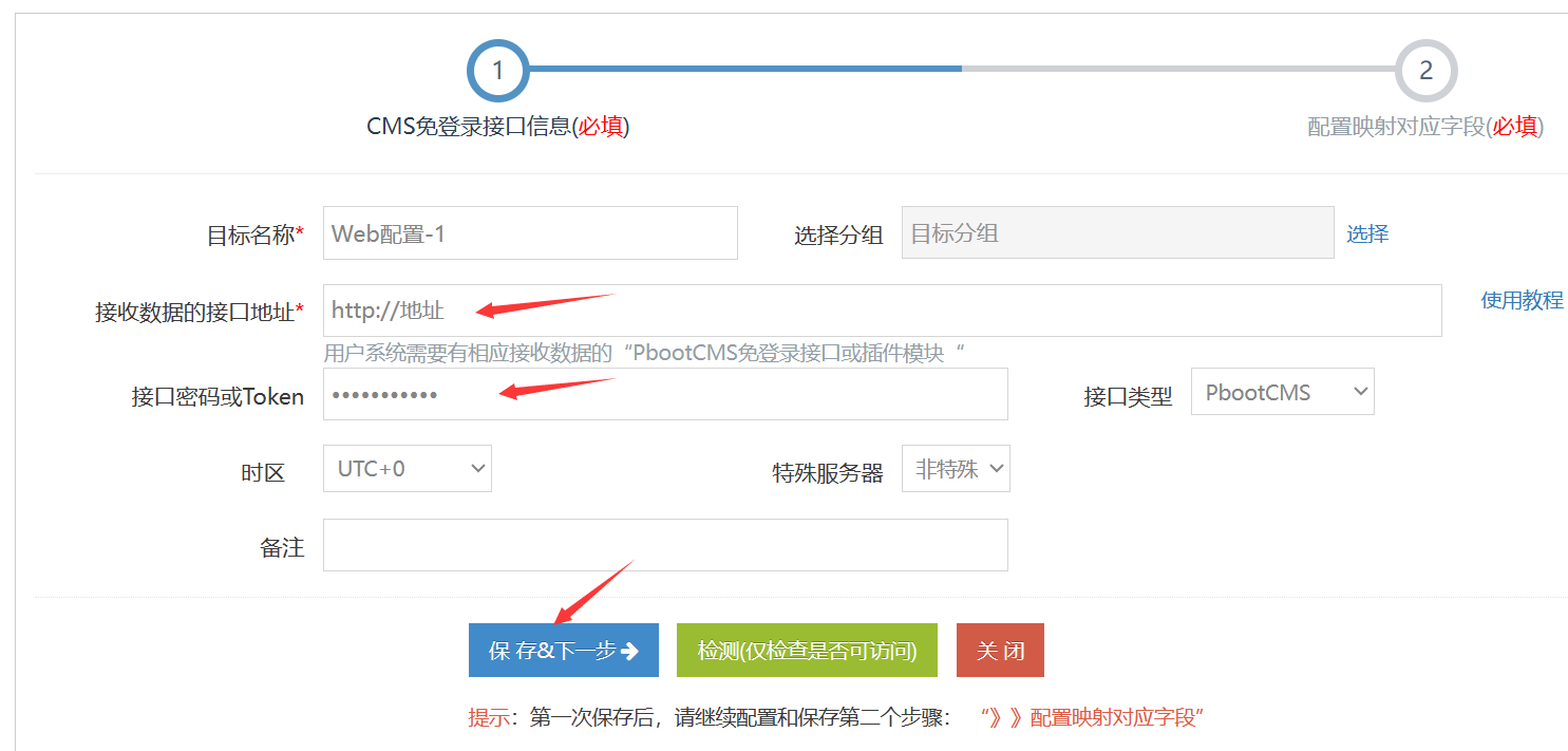 2-2)在【Web免登录接口信息】处,填写PbootCMS采集发布插件的接口地址和发布密码;