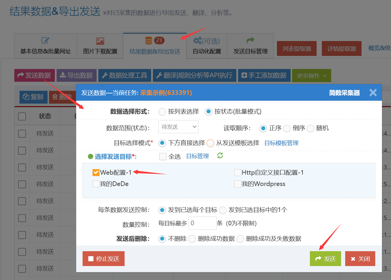 最后点击结果数据页的【发送数据】按钮,选择数据发送范围,勾上对应PbootCMS网站的发送目标,接着点击【发送】按钮,简数采集器便会自动发布文章数据到Pboot网站。