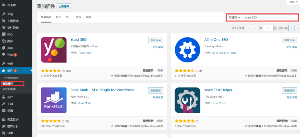 在 WordPress后台的“插件”部分下,选择安装插件,然后搜索Yoast SEO: