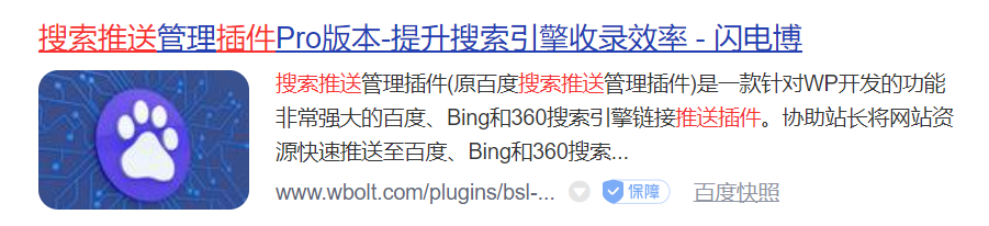 例如,假设您在百度中搜索“搜索推送插件”,你可以看到我们关于此关键词的文章在搜索引擎结果的展示会将该关键字加粗,因为它与搜索词相关。通过在您的元描述中包含核心关键字,您可以更加突出:
