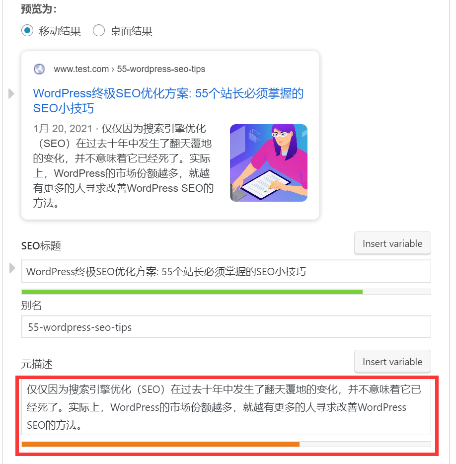 另外,点击率越高,搜索引擎会判断网站内容与搜索关键词越相关,自然网页排名越高。因此,从某种意义上说,元描述会间接影响网页排名。您可以在Yoast SEO插件中手动设置元描述: