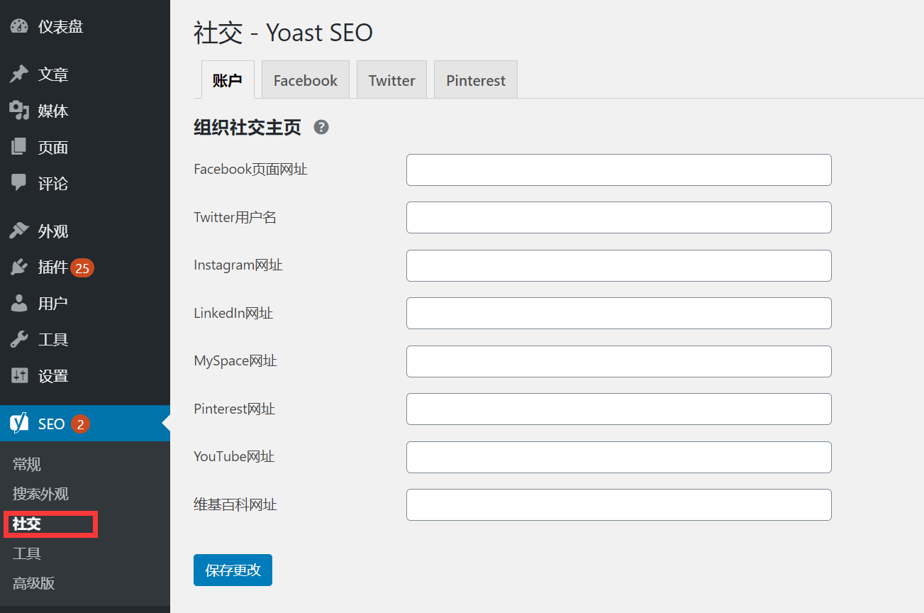 部分主题会默认使用了社交标签代码,但有些主题没有。对于没有的主题,我们可以使用Yoast SEO插件补充这些页面代码标签。安装使用此插件进行配置后会添加必要的社交网站数据标签。虽然尚不清楚这会对WordPress SEO产生多大影响,但让Google知道哪些社交媒体资料与您的品牌相关联并没有什么坏处。