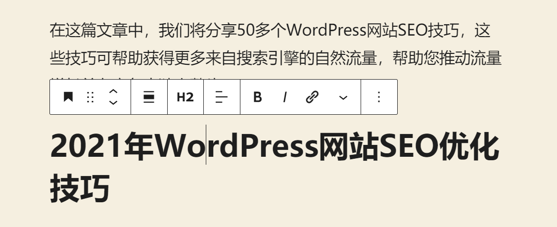 这会自动为选定的文本分配Google读取您的标头所需的HTML标签。在古腾堡编辑器中,可以使用标题块来实现相同的效果: