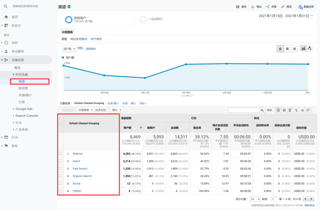 你可以通过流量获取-所有流量-渠道,查看所有流量来源(包括自然搜索流量):