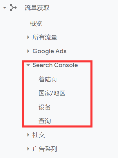 然后,在你Google Analytics(分析)帐户中对应域名下会添加一个Search Console入口,可以查看着陆页,国家/地区,设备和查询等:
