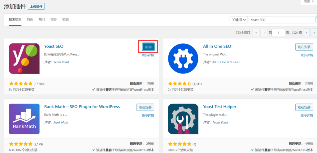 在搜索结果列表中找到Yoast SEO插件,点击旁边的“ 现在安装” 按钮即可安装。