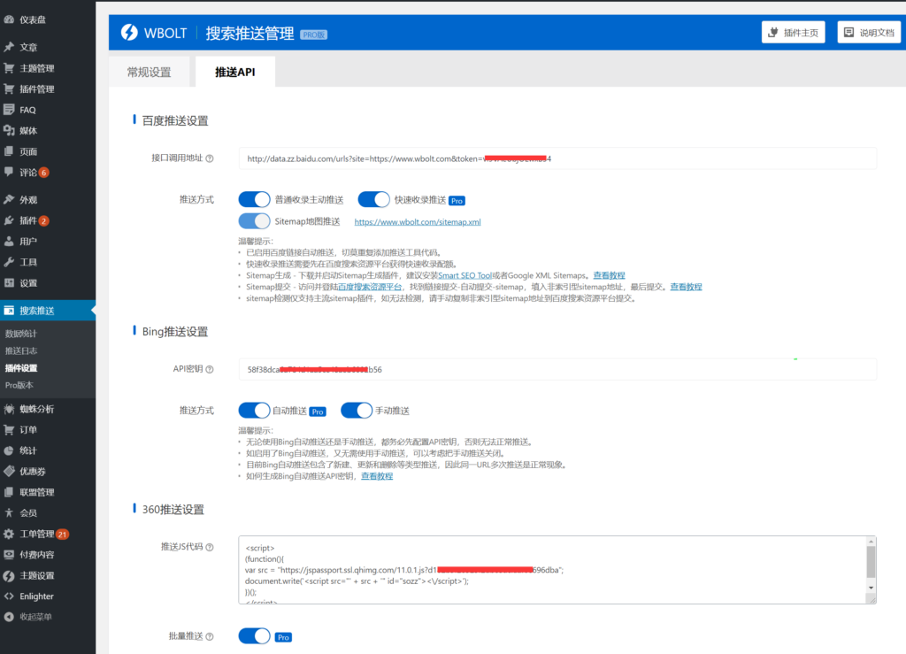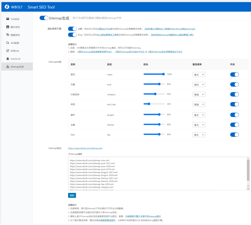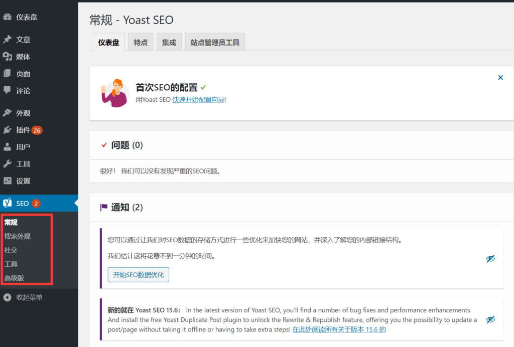 启用插件后,在WordPress后台左边栏菜单会展示一个新的SEO菜单: