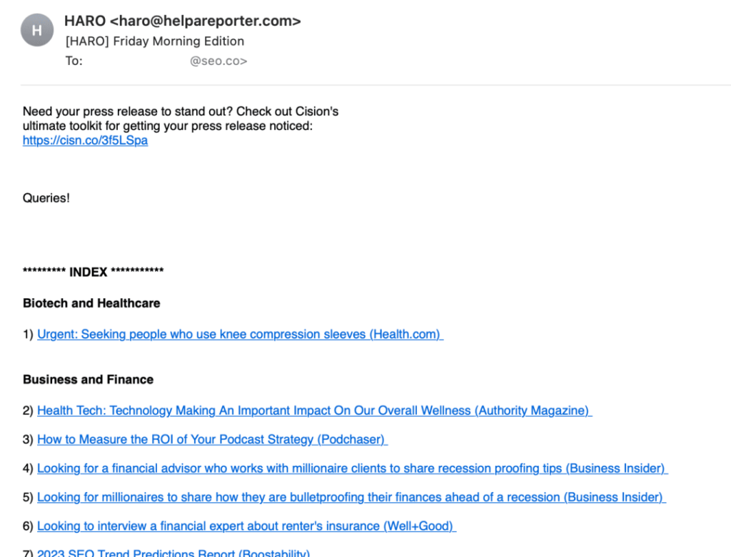 寻找链接机会的 HARO 投稿电子邮件示例。