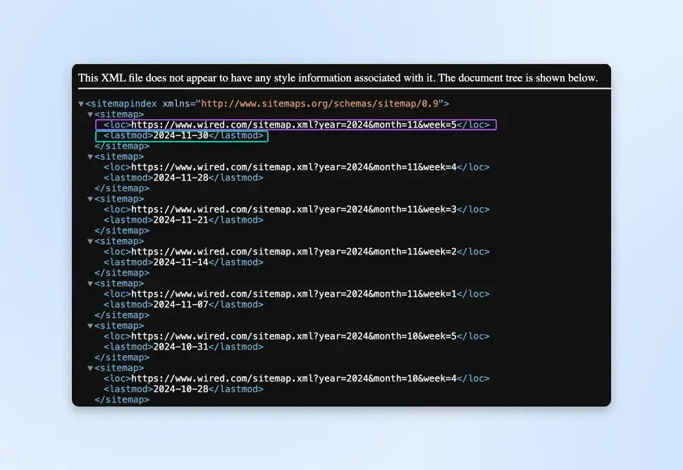 专业提示:如果您看到的是乱码,不用担心,这是正常现象。XML 文件在浏览器中通常看起来很乱。重要的是您可以看到列出的 URL。