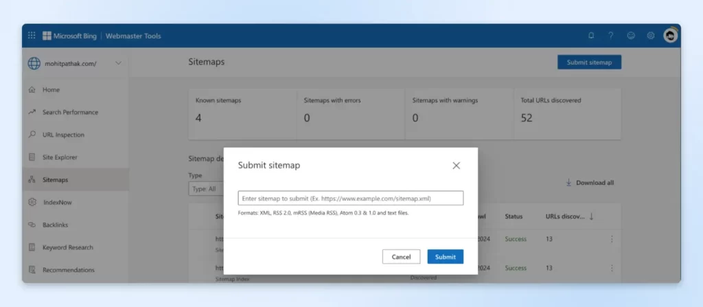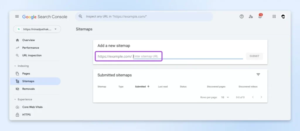 - 在“添加新网站地图”字段中输入网站地图 URL,然后点击提交。