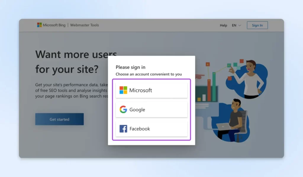 1. 登录或创建 Microsoft 帐户: 访问必应网站管理员工具,使用 Microsoft、Google 或 Facebook 帐户登录。如果你没有账户,创建微软账户既快捷又免费。