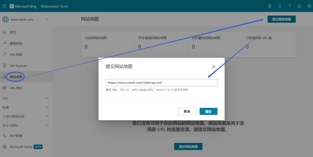 如果你已经注册了必应站长工具,我们可以添加新的站点URL。