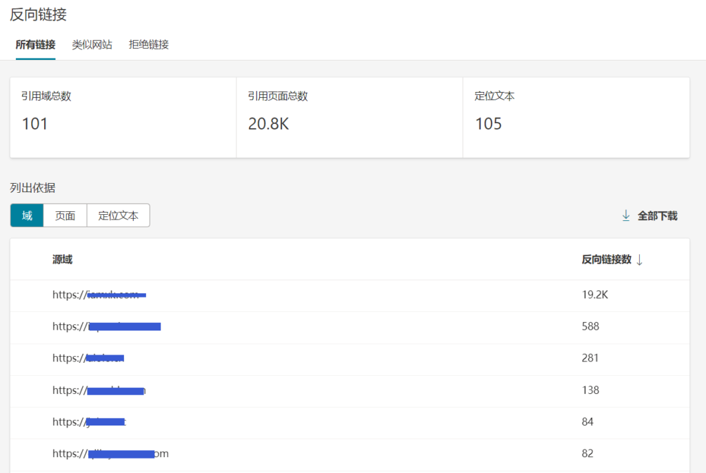 反向链接报告显示……嗯,Bing发现的所有反向链接都指向您的站点。这对于查看您是否有任何地方随着时间的推移获得或失去链接很有用。