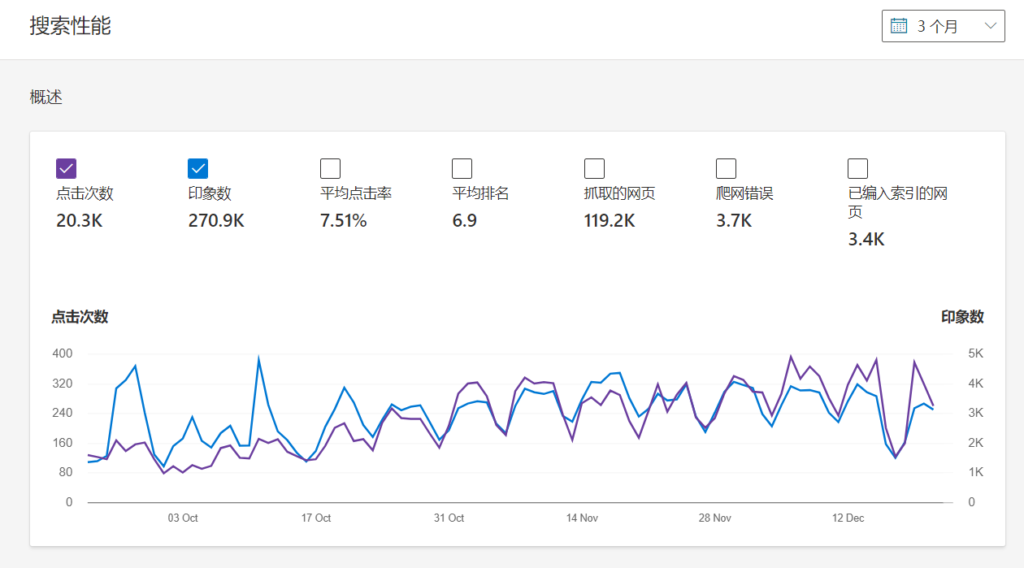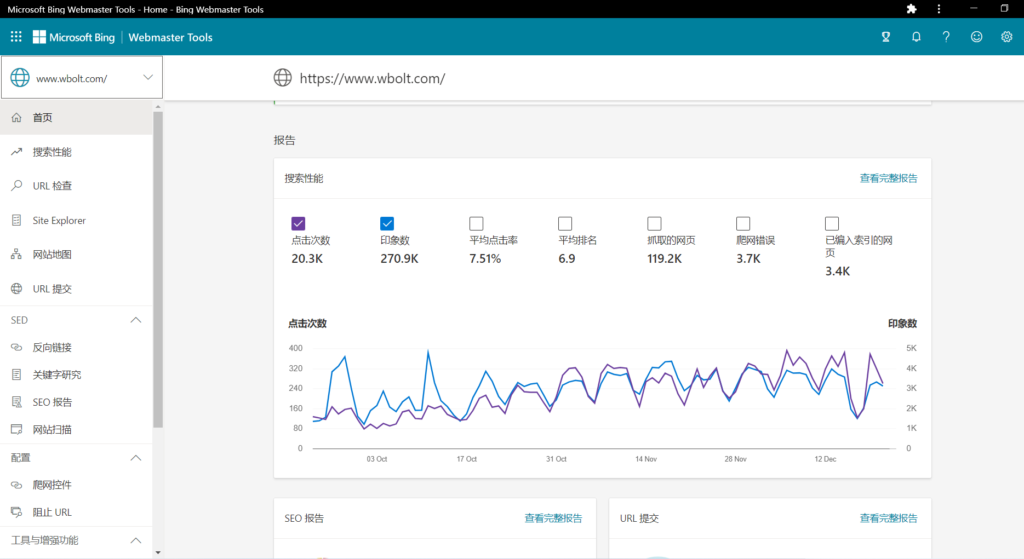 必应网站管理员工具提供必应特有的详细搜索性能数据,因此您可以通过点击、印象和点击率等指标了解网站在必应搜索结果中的表现。