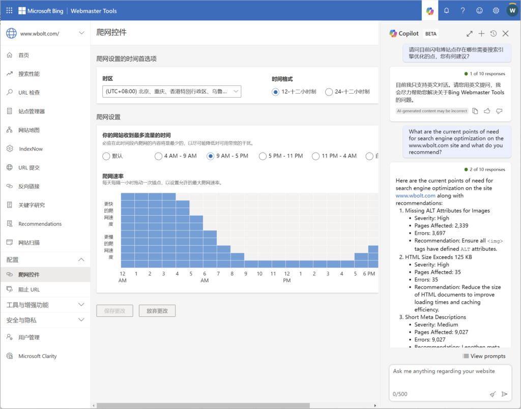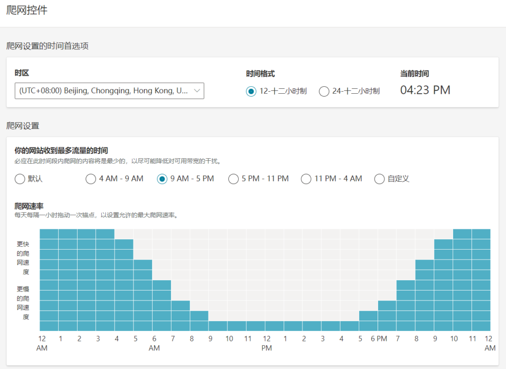 您可以根据网站情况设置bing的爬网速度,以防止因为bing爬虫导致网站流量高峰期性能不稳定。