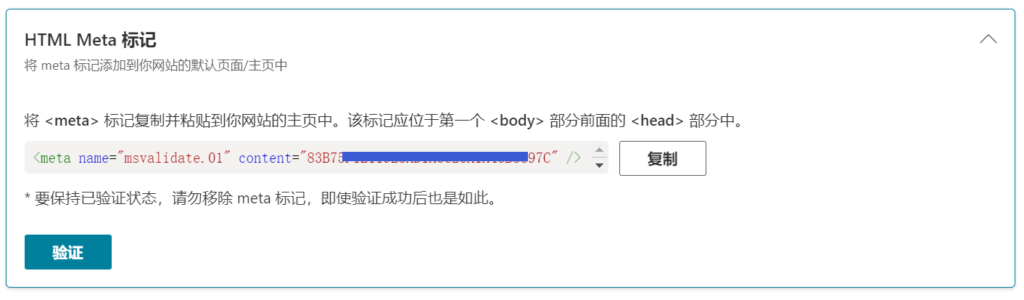 - 元标签验证:复制必应提供的元标签,并将其粘贴到网站主页 HTML 的