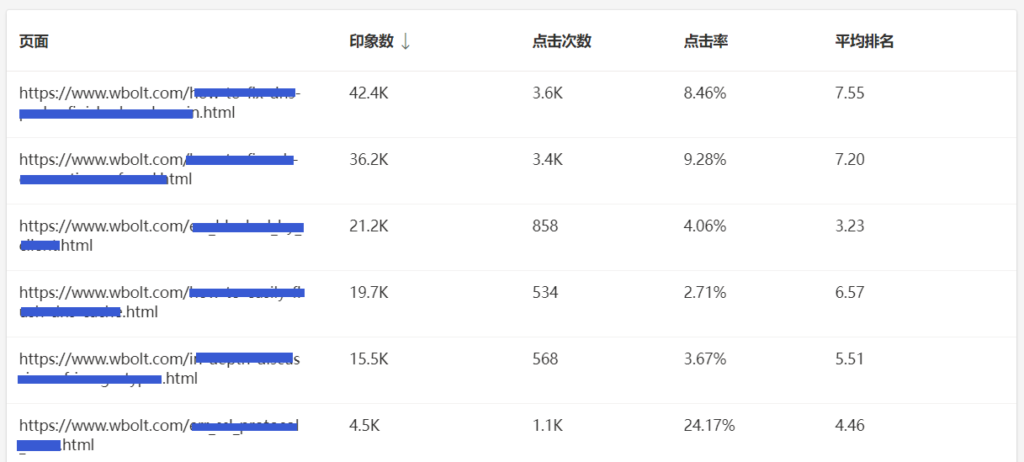 搜索关键字报告会显示您从中获得展示次数和点击次数的自然关键字。基本上是出现在Bing中的顶级URL。您还可以查看您的网站在点击率方面的表现。