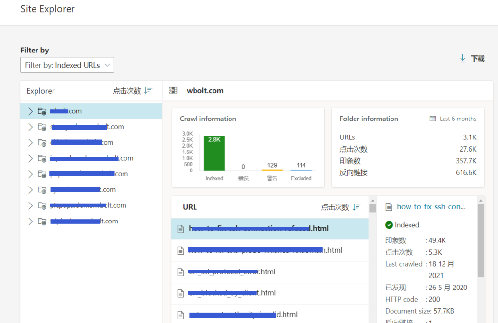 索引资源管理器可让您查看 Bing 已抓取(或尝试抓取)哪些页面。它为您提供诸如发现的 URL 数量、搜索中出现的数量、点击次数和入站链接计数等数据。您可以滚动文件夹并查看站点特定区域的数据。